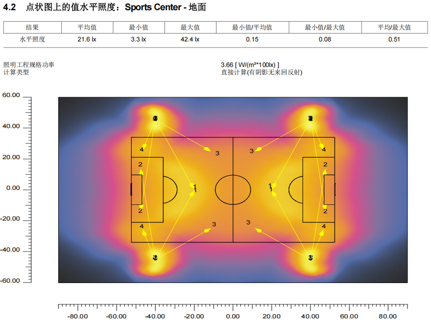 設(shè)計足球場面積合理,其中布置燈具擺放合理,符合照明標(biāo)準(zhǔn)。