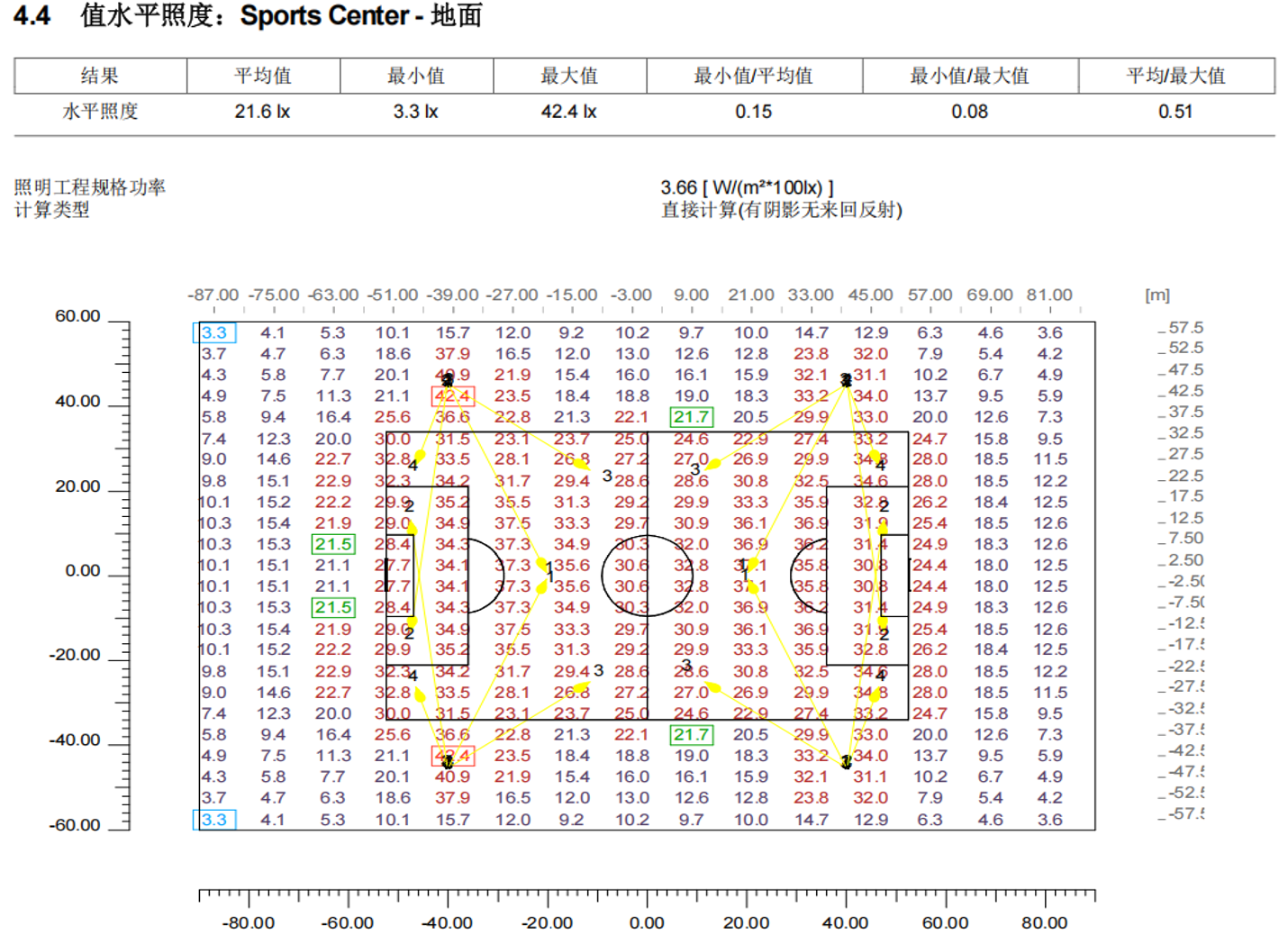 符合國家運(yùn)動場所照明標(biāo)準(zhǔn),燈光布置合理,燈光均勻,綠色環(huán)保等;