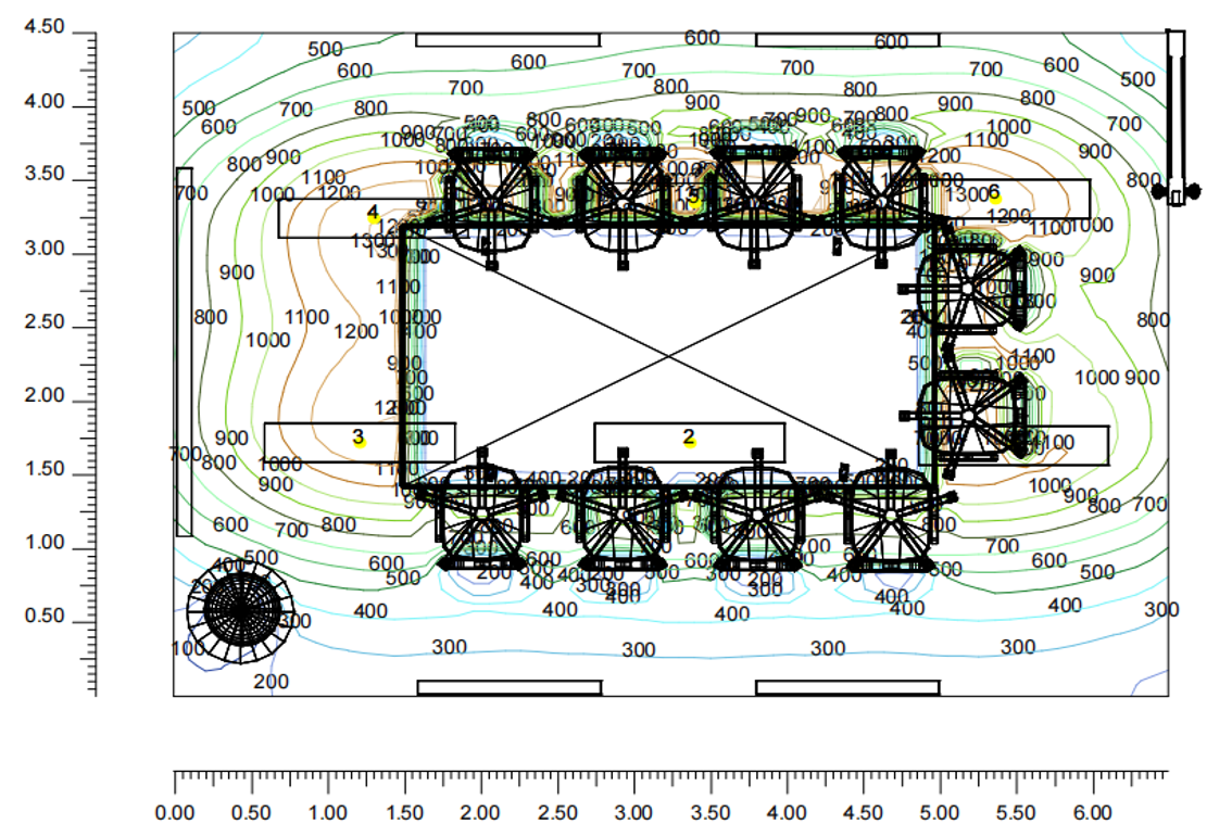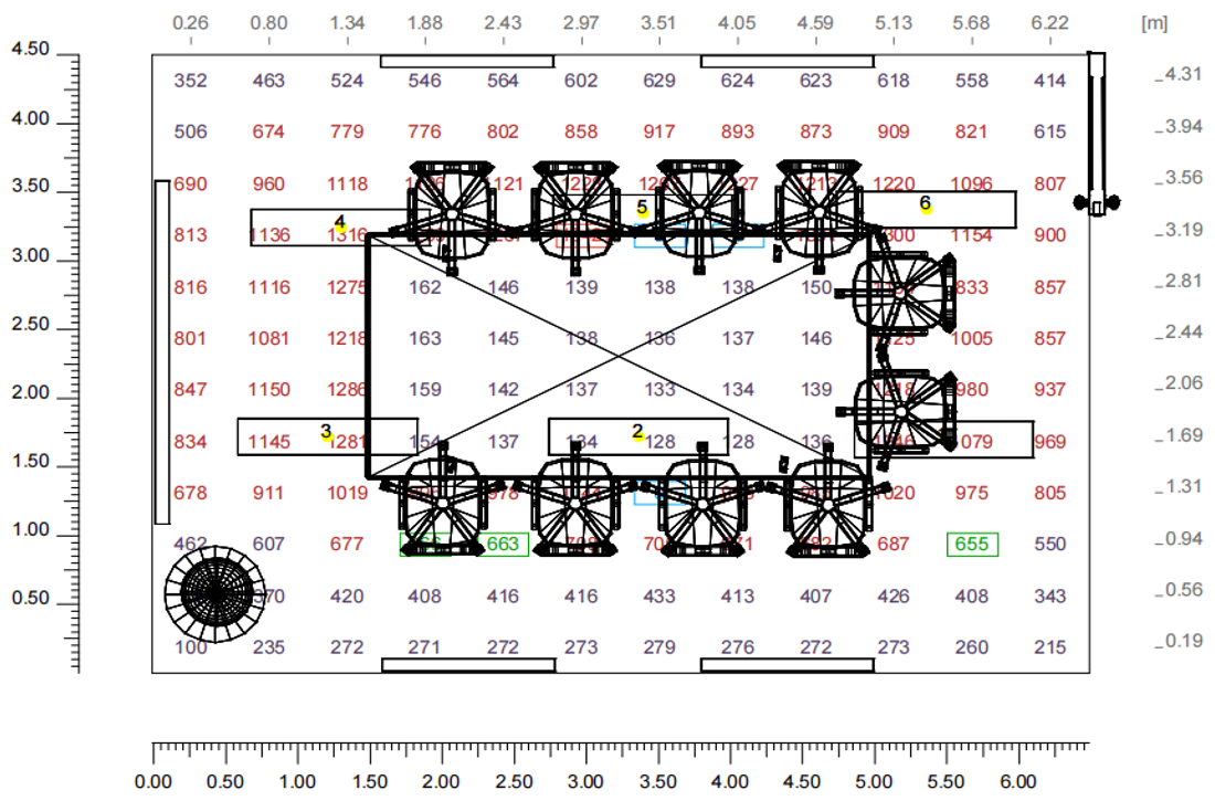 數(shù)值圖顯示區(qū)域照度為600lx-800lx,平均照度為660lx,滿(mǎn)足設(shè)計(jì)標(biāo)準(zhǔn)