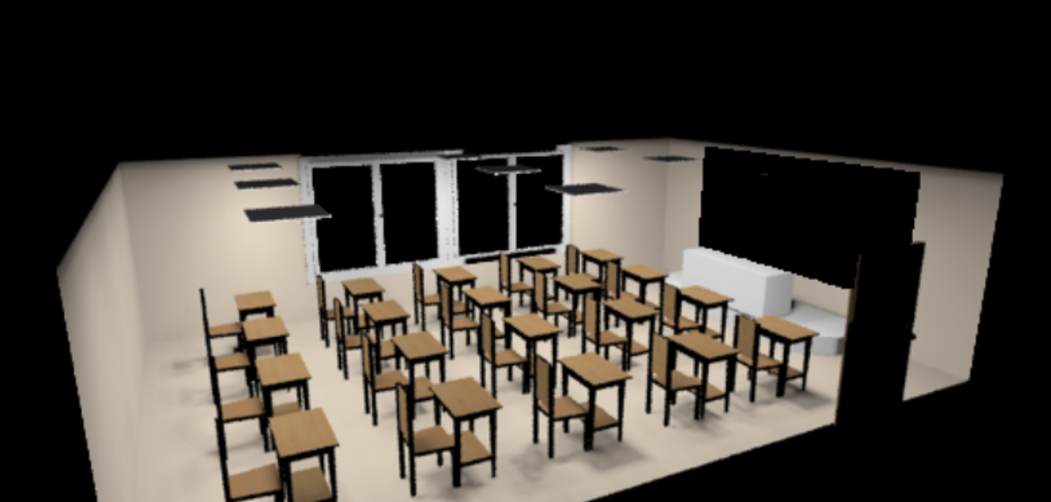 該渲染圖呈現(xiàn)了一個(gè)光線分布均衡、燈具擺放合理的教室場(chǎng)景,增強(qiáng)了場(chǎng)景的真實(shí)感。