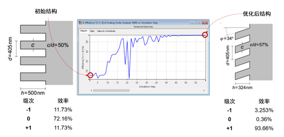 通過高速物理光學(xué),可以對(duì)1D和2D微納光柵進(jìn)行嚴(yán)格的電磁分析,獲得相應(yīng)的近場(chǎng)、衍射級(jí)次以及衍射效應(yīng),同時(shí)能夠?qū)鈻胚M(jìn)行優(yōu)化,以獲得所需要光柵結(jié)構(gòu)參數(shù)并集成到整個(gè)光學(xué)系統(tǒng)中進(jìn)行分析。