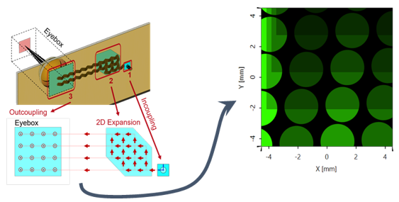 針對(duì)AR,VR以及MR應(yīng)用,VirtualLab Fusion為用戶提供了多通道波導(dǎo)成像系統(tǒng)的非序列建模技術(shù),建模過程中能夠?qū)Σㄇ安、能流以及PSF/MTF進(jìn)行評(píng)估。