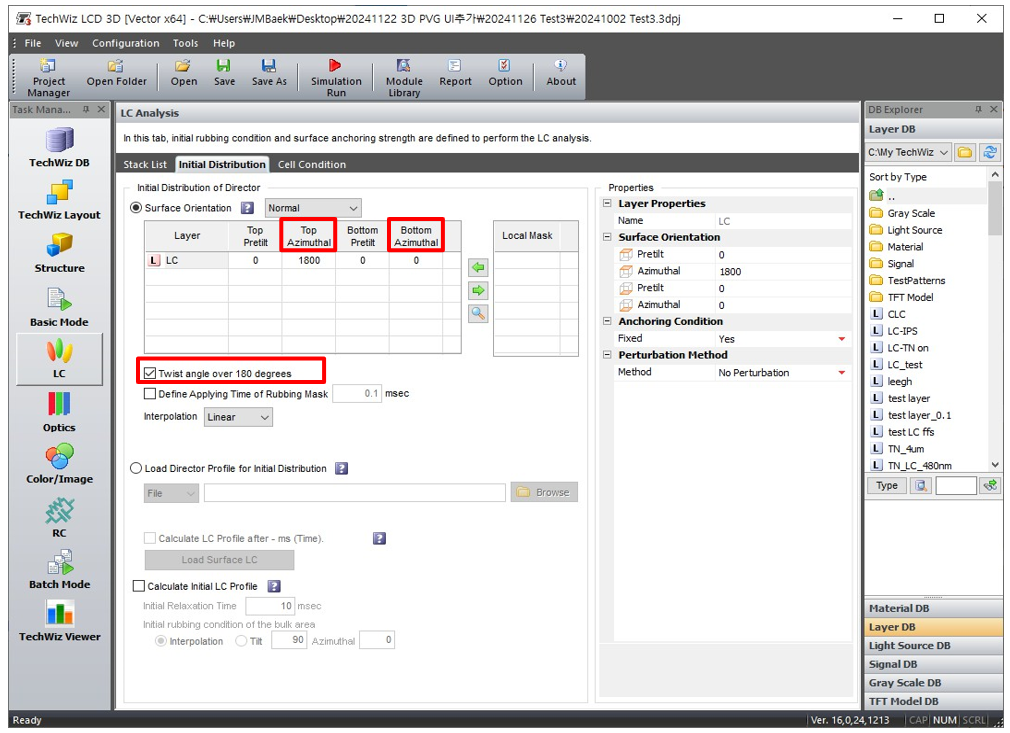 使用摩擦角,LC可轉(zhuǎn)動(dòng)180°以上(TechWiz LCD 3D / LC / Initial Distribution / ‘Twist angle over 180 degrees)