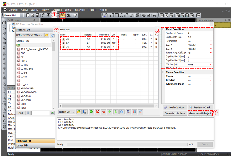 b) ① SIM (生成) → ②堆棧層并設(shè)置厚度→ ③設(shè)置網(wǎng)格條件→ ④ 生成網(wǎng)格
