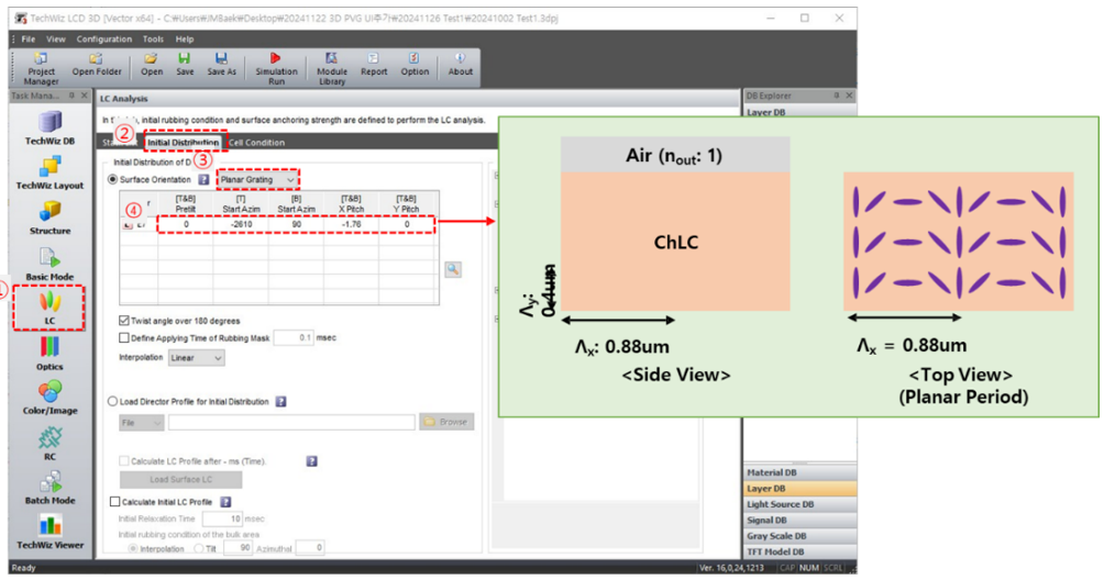 c) ①加載項(xiàng)目文件并選擇LC選項(xiàng)卡→ ②初始分布→ ③選擇平面光柵的表面方向 ④設(shè)置表面方向(+: 右旋手性/ -: 左旋手性)