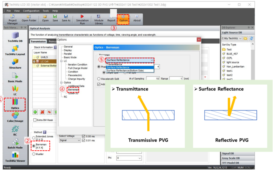 d) ①選擇光學(xué)選項(xiàng)卡→ ②選擇Berreman的方法→ ③ 選項(xiàng) → ➃ Berreman → ⑤選擇模式(表面反射率)