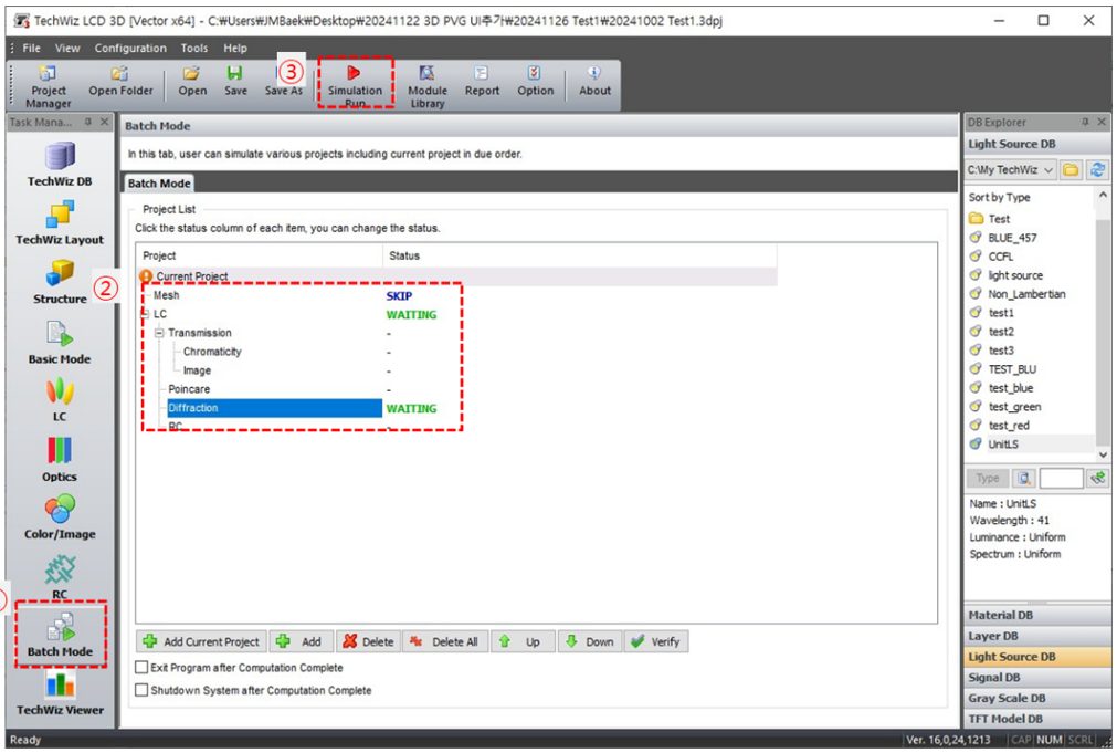 g) ①選擇批處理模式→ ②設(shè)置狀態(tài)→ ③ 仿真運(yùn)行