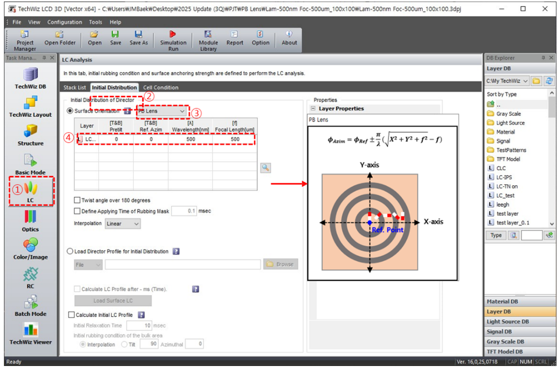 c) ①加載項目文件并選擇LC選項卡→ ②初始分布→ ③選擇平面光柵的表面方向→ ➃設(shè)置表面方向