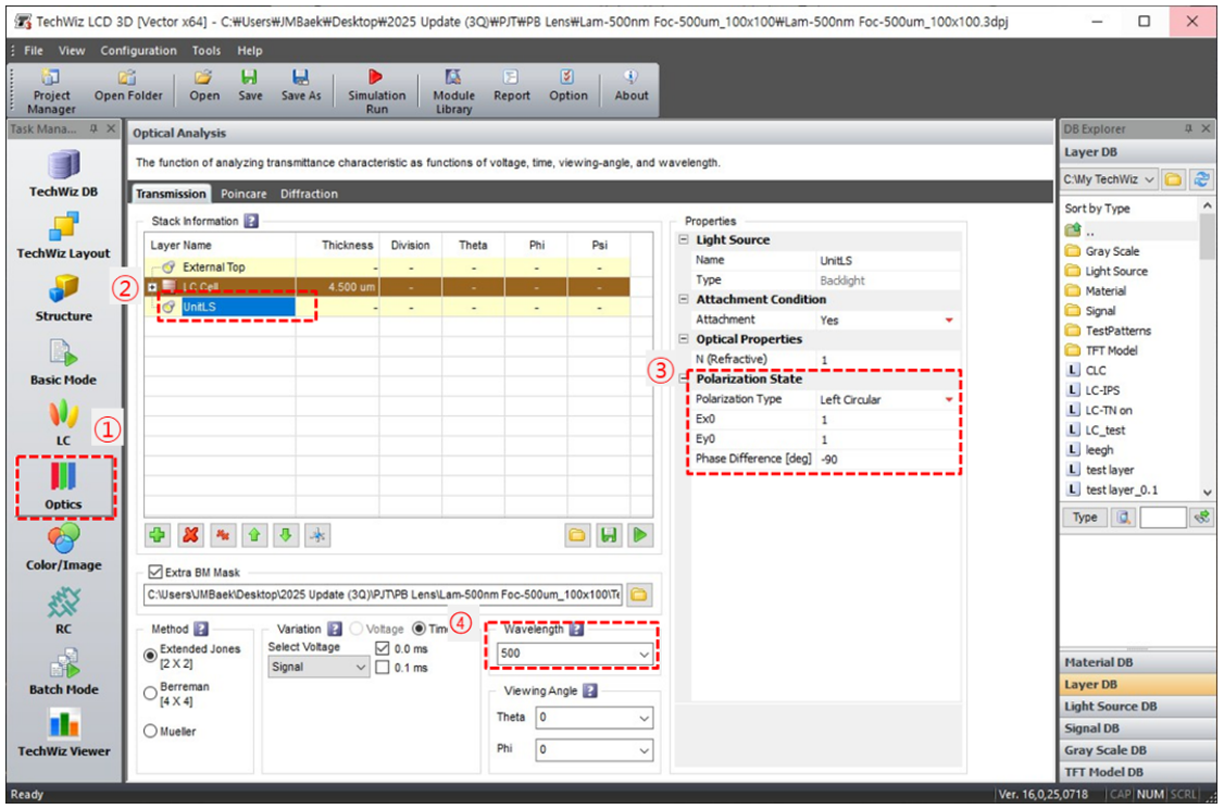 d) ①選擇光學(xué)選項卡→ ②疊加光源→ ③設(shè)置偏振類型(左旋圓偏光)→ ➃ 設(shè)置波長