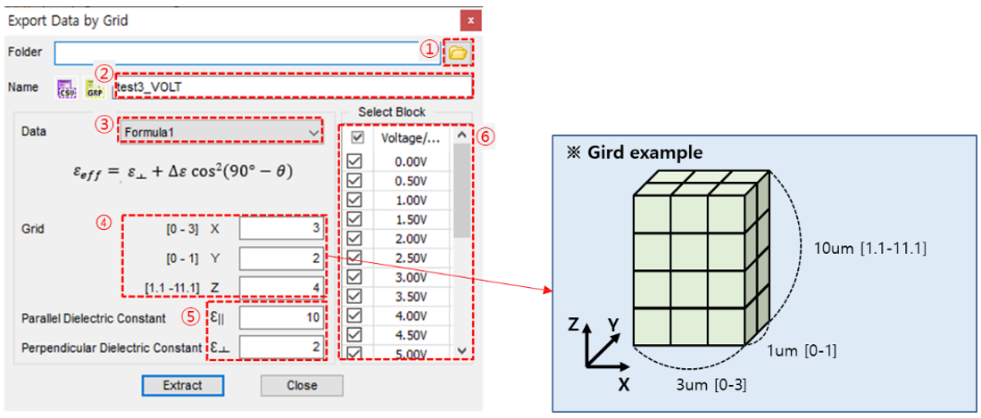 c) ①設(shè)置文件保存路徑→ ②設(shè)置文件名→ ③選擇有效介電常數(shù)公式→ ➃設(shè)置網(wǎng)格(劃分數(shù))→ ⑤設(shè)置LC介電常數(shù)→ ⑥選擇電壓或時間
