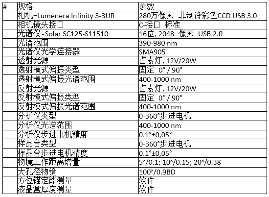 該裝置可進(jìn)行扭曲向列相液晶盒中液晶扭曲角的自動(dòng)測(cè)量及其方位錨定能的計(jì)算[V. A. Konovalov, A. A. Muravski, S. Ye.Yakovenko, J. Pelzl, An Accurate Spectral Method for Measuring Twist Angle of Twisted Cells with Rubbed and Grooved Surfaces, SID Symp. Dig. Tech. Pap. 31, 1, pp. 620-623 (2000)]。