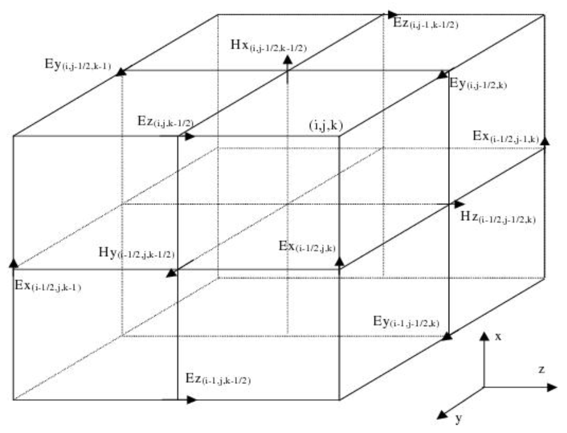 FDTD依賴于求解域的空間和時間的離散化。耦合的電磁場沿著由Yee單元組成的網(wǎng)格進(jìn)行離散化。磁場和電場分量以交錯的方式定位在每個單元的邊緣上。 通過計(jì)算立方體的相對邊緣上的兩個場分量之間的有限差分,可以獲得場的空間導(dǎo)數(shù)的二階近似。有限差分法同樣用于近似場的時間導(dǎo)數(shù)。用于計(jì)算和更新每個時間步的電場和磁場的模擬空間的算法稱為Yee算法。當(dāng)空間和時間步長趨于零時,計(jì)算問題的解的精度應(yīng)收斂。這種增加的準(zhǔn)確性是以完成模擬所需的時間和存儲模擬所需的內(nèi)存為代價的。