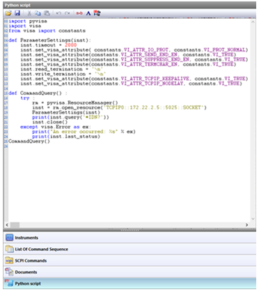 OptiInstrument軟件支持Python腳本編寫。 使用該工具為單個(gè)SCPI命令或命令列表生成Python腳本。 生成的腳本可以保存到文件中。 可以從OptiInstrument GUI或命令提示符或Windows PowerShell中執(zhí)行生成的腳本。 可以將Python腳本加載到OptiInstrument GUI中并由該GUI執(zhí)行。 圖3顯示了為一系列SCPI命令生成的Python腳本,并顯示在GUI Python腳本窗格中。 此功能使用戶可以執(zhí)行OptiInstrument GUI不支持的功能,例如邏輯控制和循環(huán)選項(xiàng)。