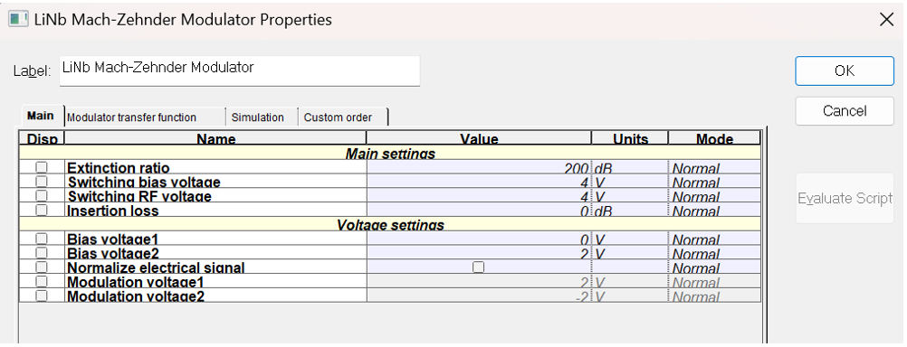 圖2.MZ調(diào)制器參數(shù)設(shè)置