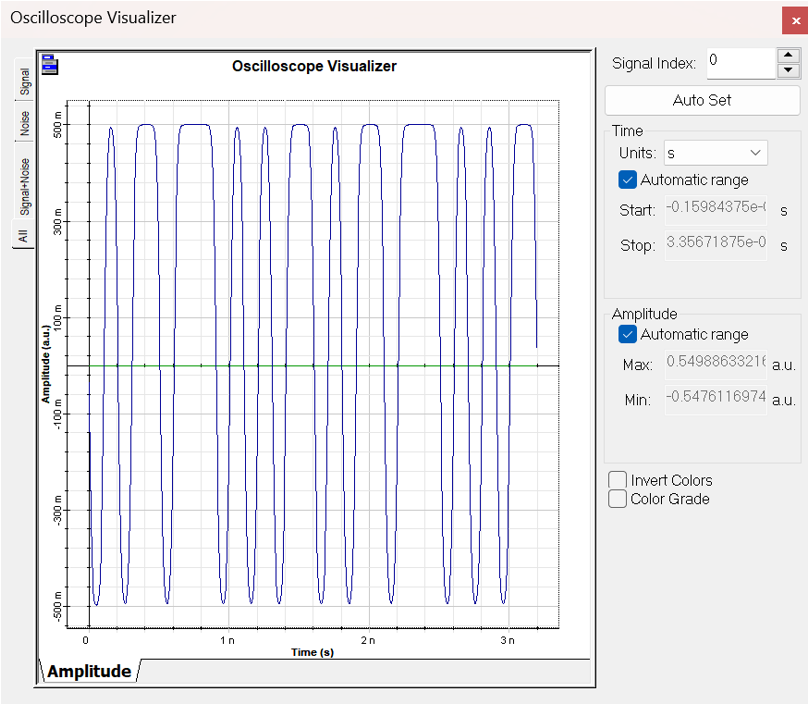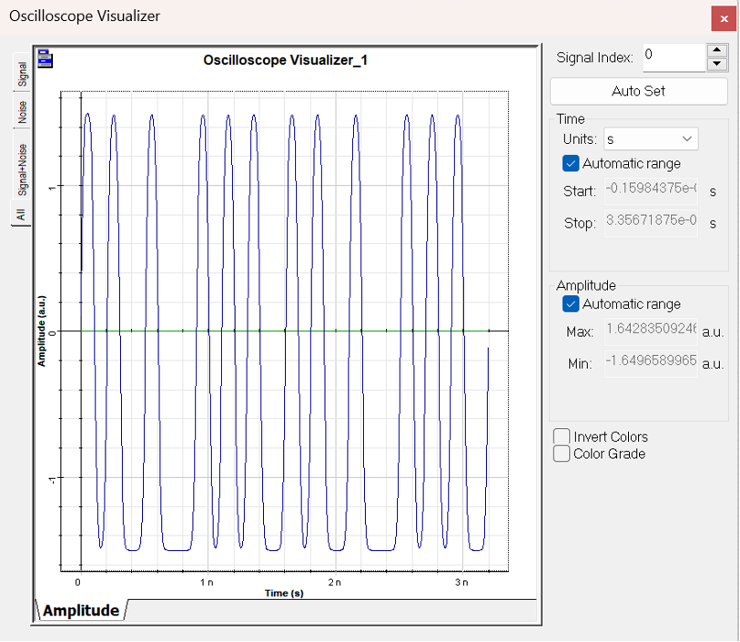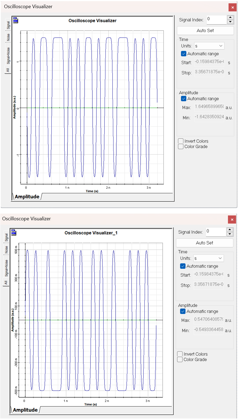 圖2是MZ調(diào)制器參數(shù)設(shè)定窗口,其中MZ調(diào)制器以正交模式工作,外置偏壓位于調(diào)制器光學(xué)響應(yīng)曲線的中點,使得偏壓強度為其峰值的一半。而消光系數(shù)設(shè)置為200dB,以避免任何由于不對稱Y型波導(dǎo)而導(dǎo)致的啁啾聲[2]。調(diào)制器被設(shè)置為以非歸一化的方式工作,這意味著電輸入信號將不會被歸一化。