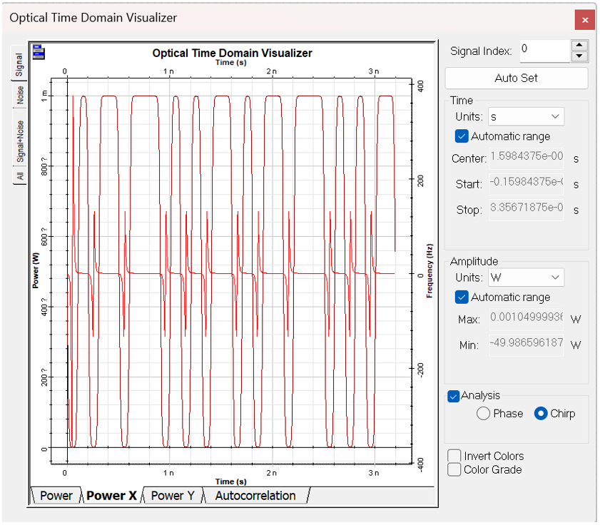 結(jié)果如圖4所示。光信號的幅度從0到1mW不等。啁啾的振幅約為100 Hz(由于其值很小,可以認(rèn)為實際上為零)。