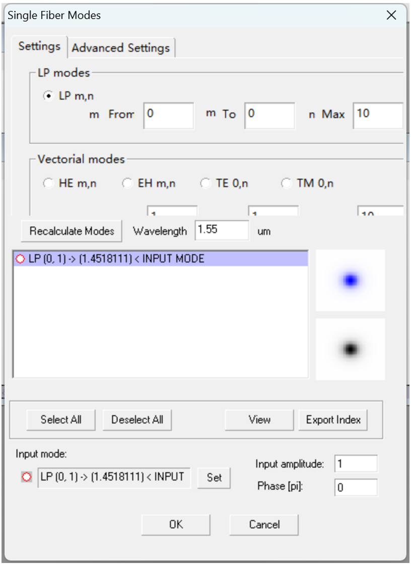注意:如果您選擇使用單光纖模塊或單波導(dǎo)模塊,您將看到在對話框中只有一個(gè)模式列表。如果您正在使用其他模式,您將看到對話框中有兩個(gè)可用的列表。