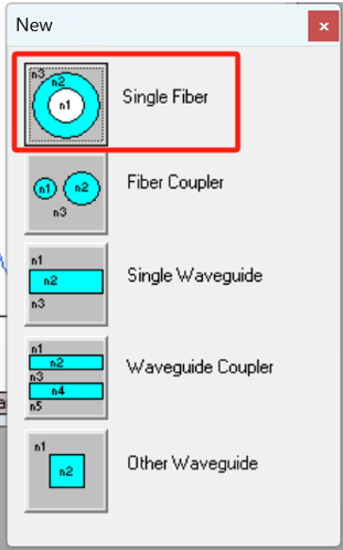 首先新建一個(gè)項(xiàng)目。然后,選擇五個(gè)可用模塊中的一個(gè)來使用: Single Fiber, Fiber Coupler, Single Waveguide, Waveguide Coupler, 和Other Waveguide。