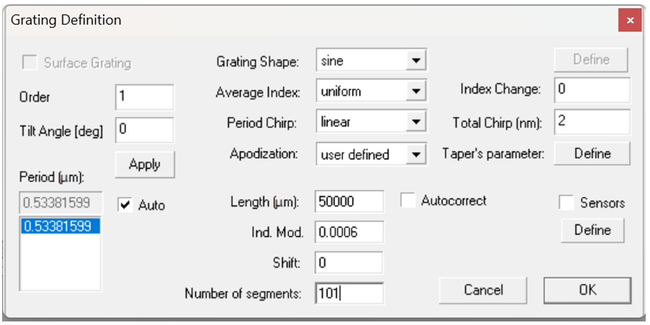 接下來,您將為單個(gè)光纖定義某些參數(shù)。在“Single Fiber”對話框中,您可以設(shè)置以下特性: Index Profile, Photosensitivity Profile, Number Of Points In Mesh, Central Wavelength等。