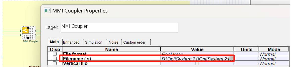 為了將設(shè)計導(dǎo)出到OptiSystem,只需將“OptiBPM component NхM”拖動到布局中,并選擇生成的“*.s”的文件路徑導(dǎo)入到Filename(圖5)。將OptiBPM中設(shè)計的MMI耦合器的傳遞函數(shù)自動導(dǎo)出到具有2個輸入和輸出的“OptiBPM component”。