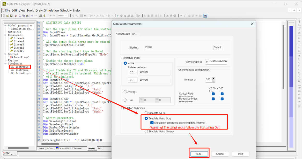 開始模擬,在“Simulation Parameter”窗口中,選擇“Simulate using script”,勾選“Simulation generates scattering data information”框,點擊“Run”。