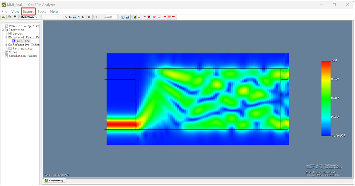 仿真完成后,在OptiBPM Analyzer上查看結(jié)果。在窗口的“Export”選項卡上,點擊“Scattering data in Cartesian Coordinates”,保存“*.s”文件。