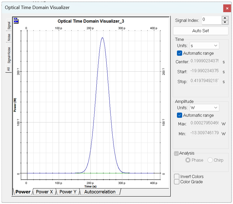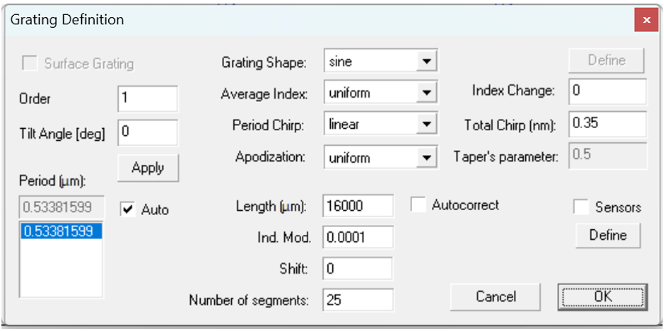 其中n為平均模式指數(shù),c為光速,Δλchirp最大啁啾是光柵兩端的布拉格波長(zhǎng)差(注意,這個(gè)量是由OptiGrating的Grating Manager中的光柵定義選項(xiàng)卡中的總啁啾參數(shù)給出的)。