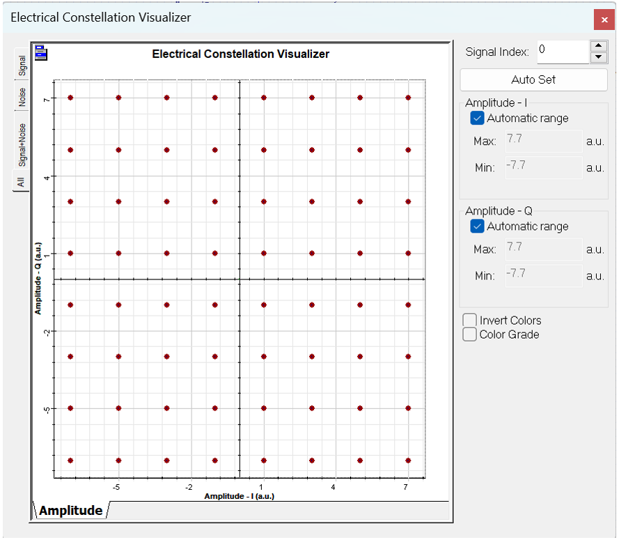 運(yùn)行仿真后,您可以從眼圖(圖2)中可視化結(jié)果。此外,您還可以可視化星座圖(圖3),其中包含64 QAM調(diào)制的同相點(diǎn)和正交點(diǎn)的結(jié)果。