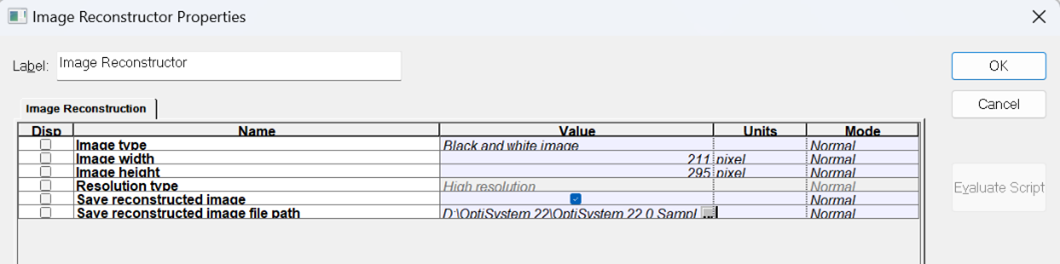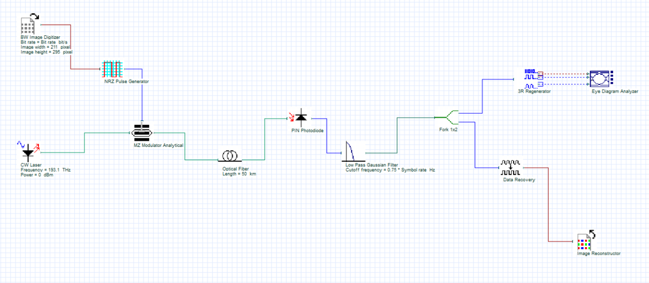 在這個鏈路中,我們將圖片導入到黑白圖像數(shù)字化組件(Black and White Image Digitizer),該組件將圖片轉(zhuǎn)化成二進制信號,生成的信號會調(diào)制載波經(jīng)過50km的光纖系統(tǒng)進行傳輸,光電轉(zhuǎn)化并濾波之后,我們用數(shù)據(jù)恢復器件(Data Recovery)來恢復二進制信號,再用圖像重構(gòu)組件(Image Reconstructor)接收二進制信號實現(xiàn)對傳輸之后圖像的恢復。
