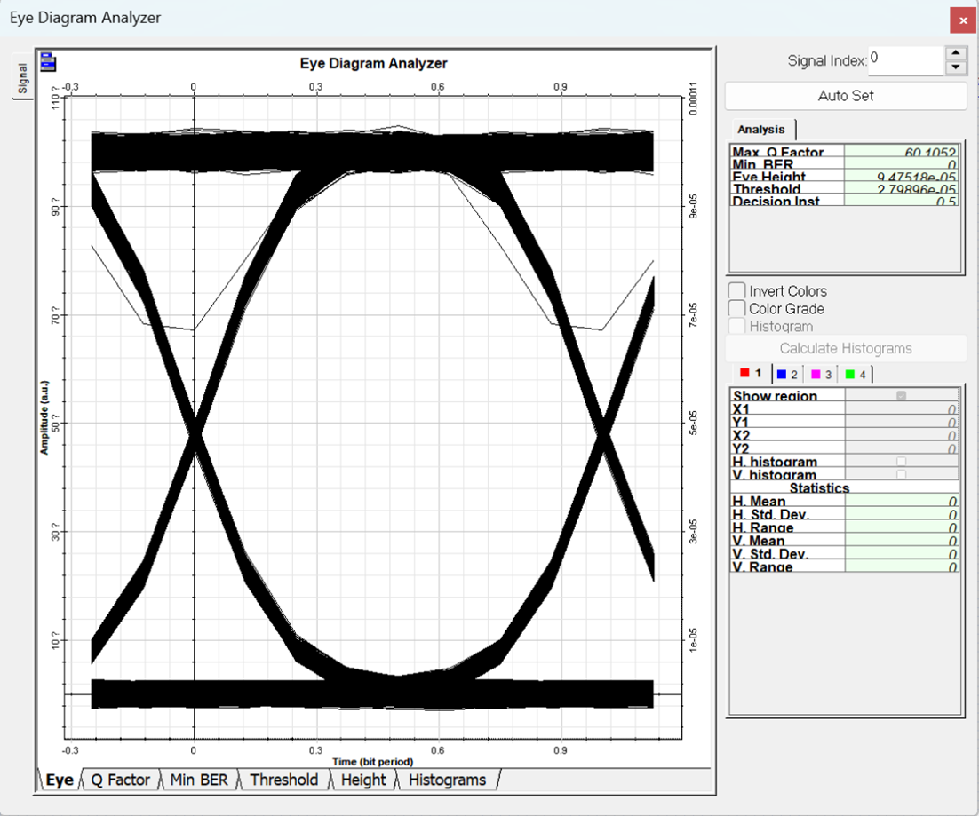 由于傳輸過程中存在損耗與色散,圖片恢復后產(chǎn)生部分失真。為了更直觀評估系統(tǒng)傳輸性能,我們可以進行眼圖分析,眼圖如圖4:
