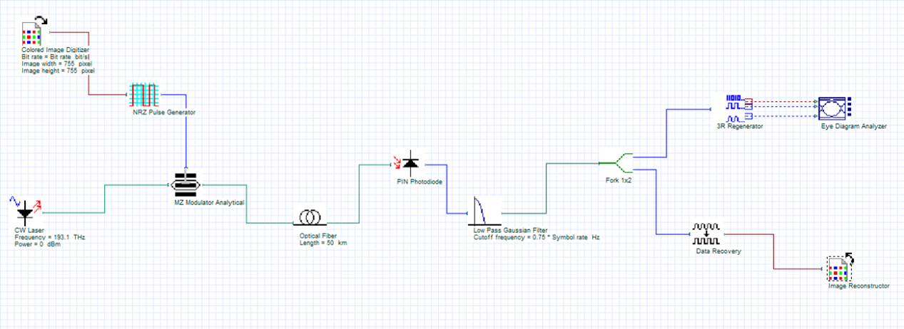 本案例的目的是仿真圖像經(jīng)過圖像處理轉(zhuǎn)化成二進制信號之后,在光纖系統(tǒng)中進行傳輸,最后經(jīng)過圖像恢復得到傳輸后的圖像,并觀察眼圖來評估傳輸質(zhì)量。
