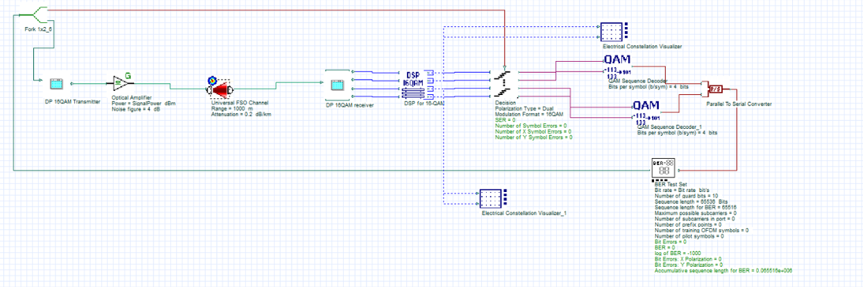 本案例仿真的內(nèi)容為DP-16QAM FSO系統(tǒng),仿真過程中考慮雨天條件下對系統(tǒng)的影響。