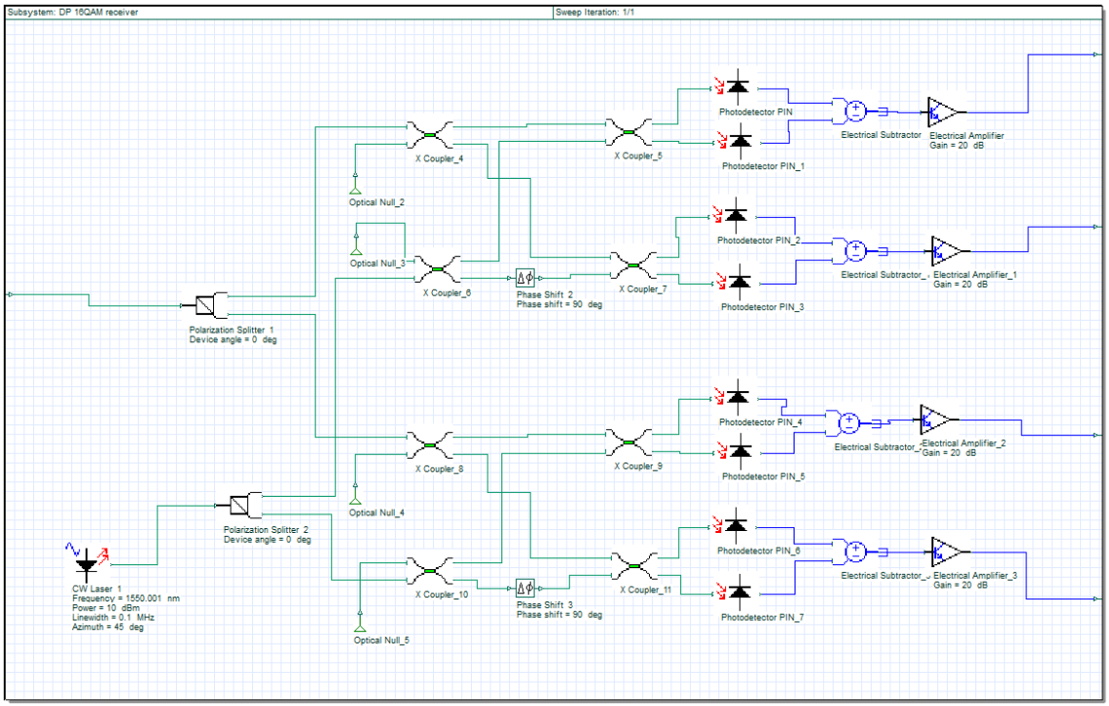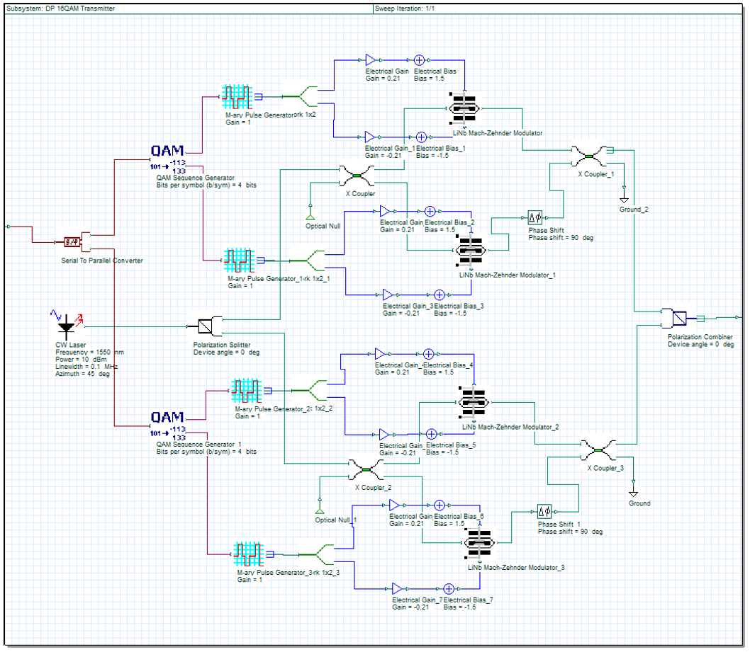 在這個鏈路中,我們將DP-16QAM的發(fā)射機部分以及接收機部分集成到子系統(tǒng)中,便于我們查看以及修改鏈路。子系統(tǒng)的鏈路布局如下圖所示。