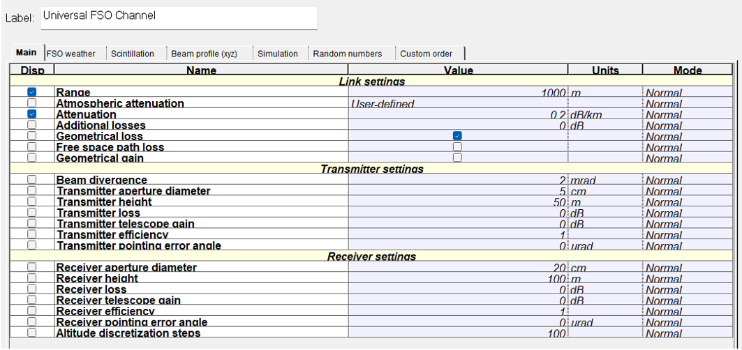 在通用FSO組件中,我們可以考慮光傳輸?shù)陌l(fā)散度,光的發(fā)射器與接收器高度、口徑以及跟瞄誤差等,設(shè)置如圖3所示。