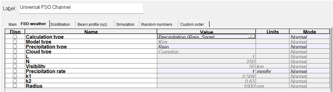 由于自由空間傳輸會受到天氣的影響,我們在仿真時應(yīng)考慮天氣狀況,圖4為傳輸天氣為雨天時通用FSO的設(shè)置: