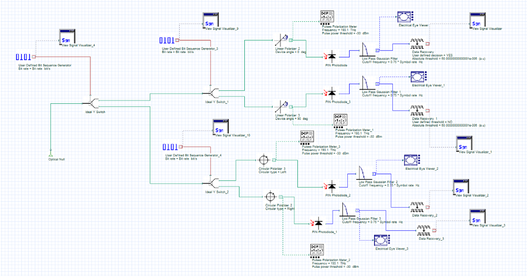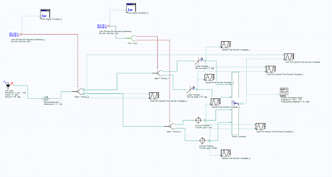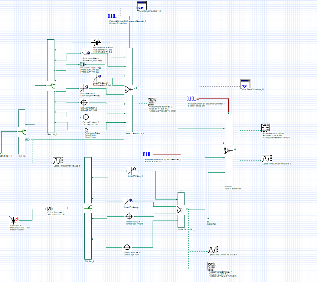 在上圖中,我們配置了連續(xù)波光源(CW激光器),并通過衰減值為0.1的光衰減器實現(xiàn)單光子量級輸出。系統(tǒng)設置了四種偏振片:水平、垂直、左對角和右對角偏振片。通過"Select"組件隨機選取四種偏振角度之一生成量子比特。