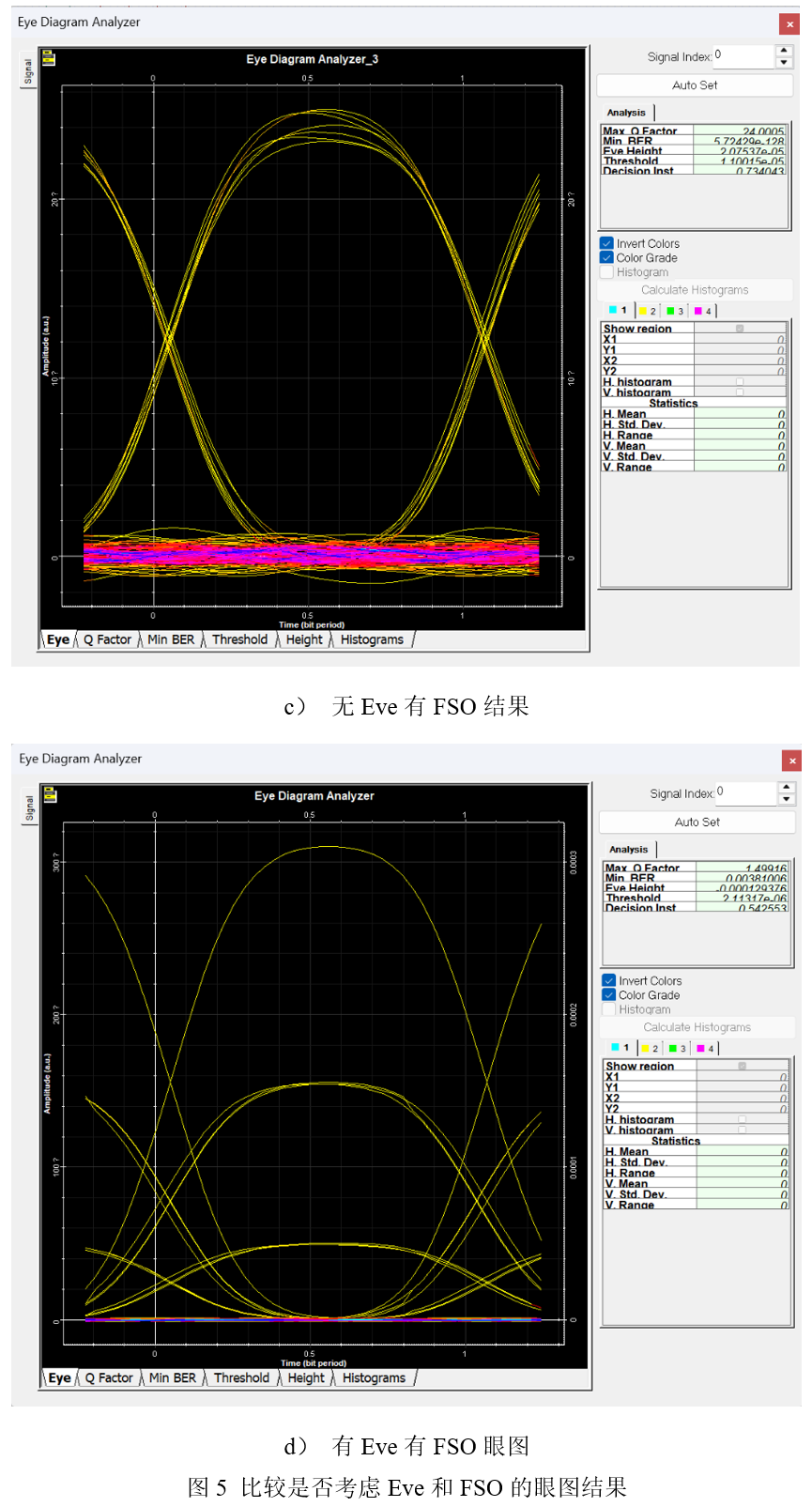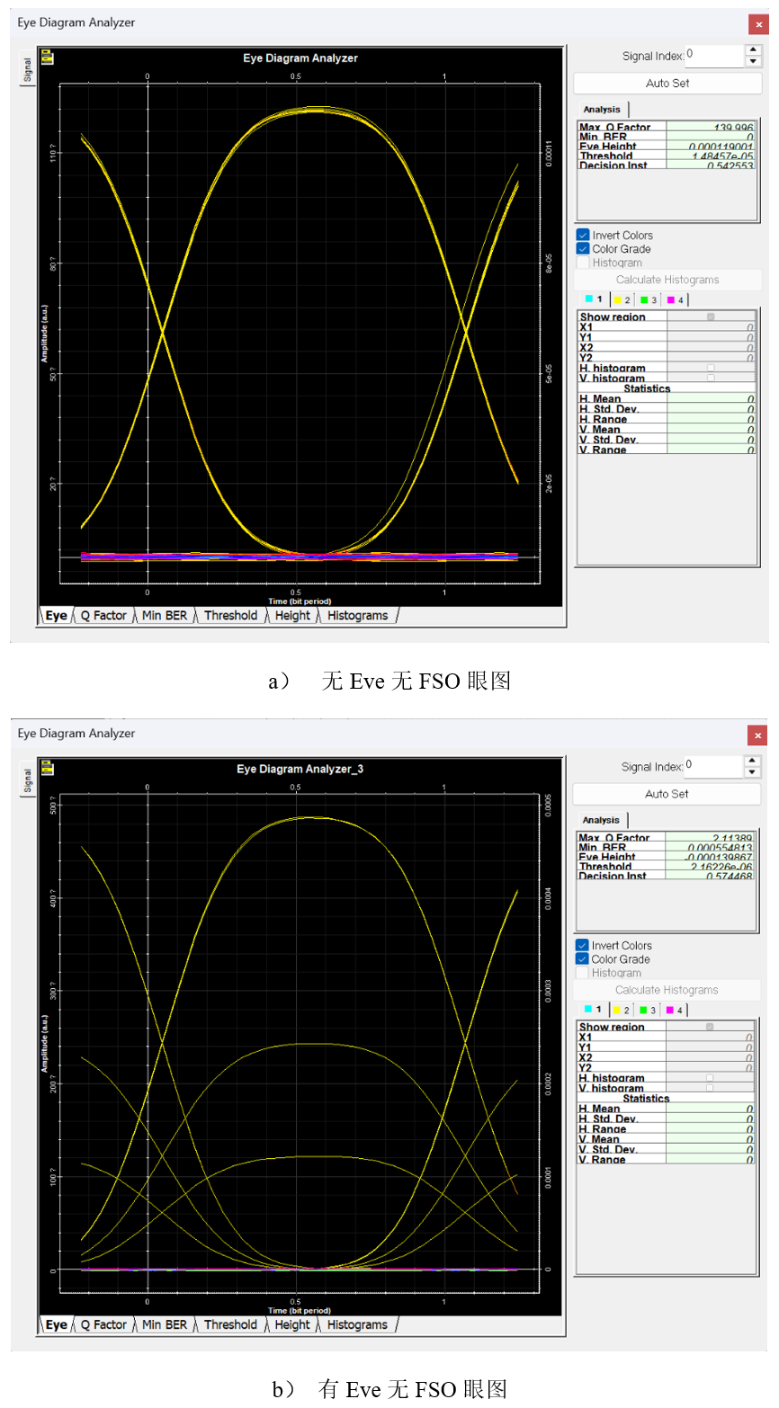 下面,我們考慮量子比特經自由空間光(FSO)傳輸后對眼圖的影響。圖4(a、b、c、d)依次為無Eve無FSO、有Eve無FSO、無Eve有FSO以及有Eve有FSO的BB84系統(tǒng)布局。