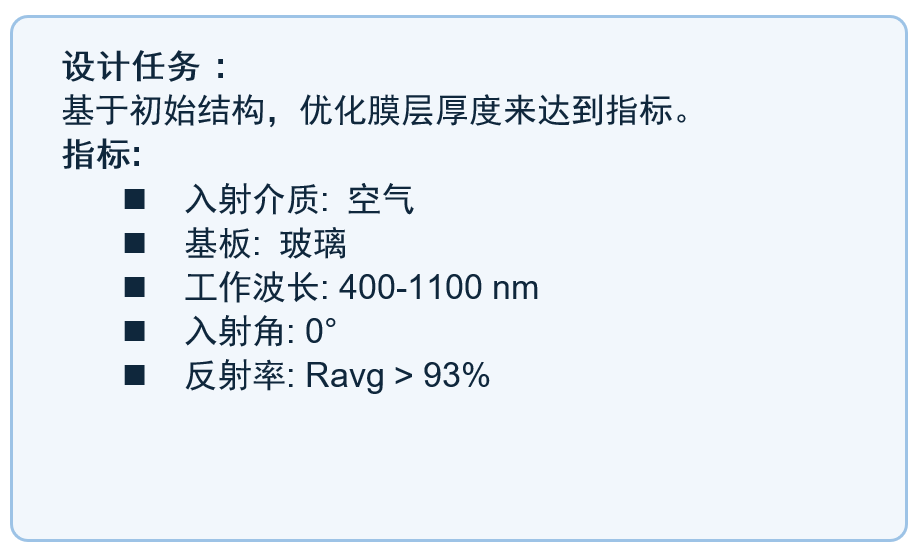 使用公式工具構(gòu)建了上述膜系作為基礎(chǔ)結(jié)構(gòu),右圖展示了其在400-1100 nm內(nèi)0°入射時的光譜?梢钥闯龃藭r平均反射率沒有達(dá)標(biāo)。接下來需要借助優(yōu)化工具進一步優(yōu)化介質(zhì)層
