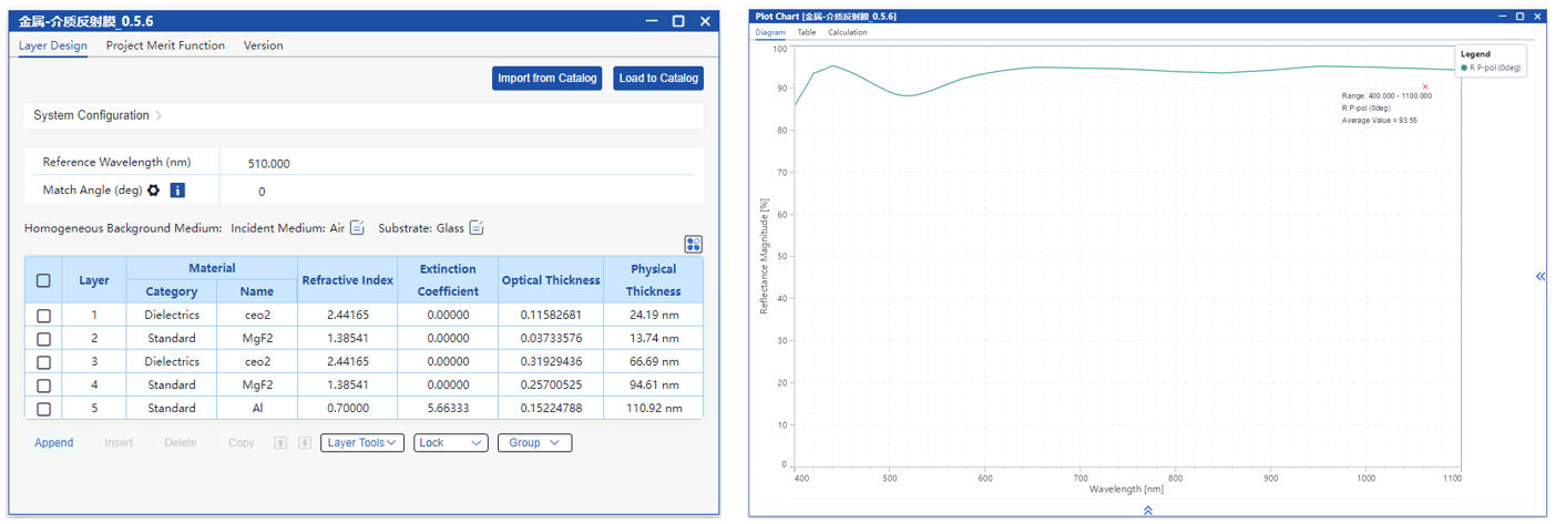優(yōu)化后的結(jié)果如上所示,右圖展示了最終的光譜數(shù)據(jù),工作波段的平均反射率為93.545%,滿足設(shè)計要求。