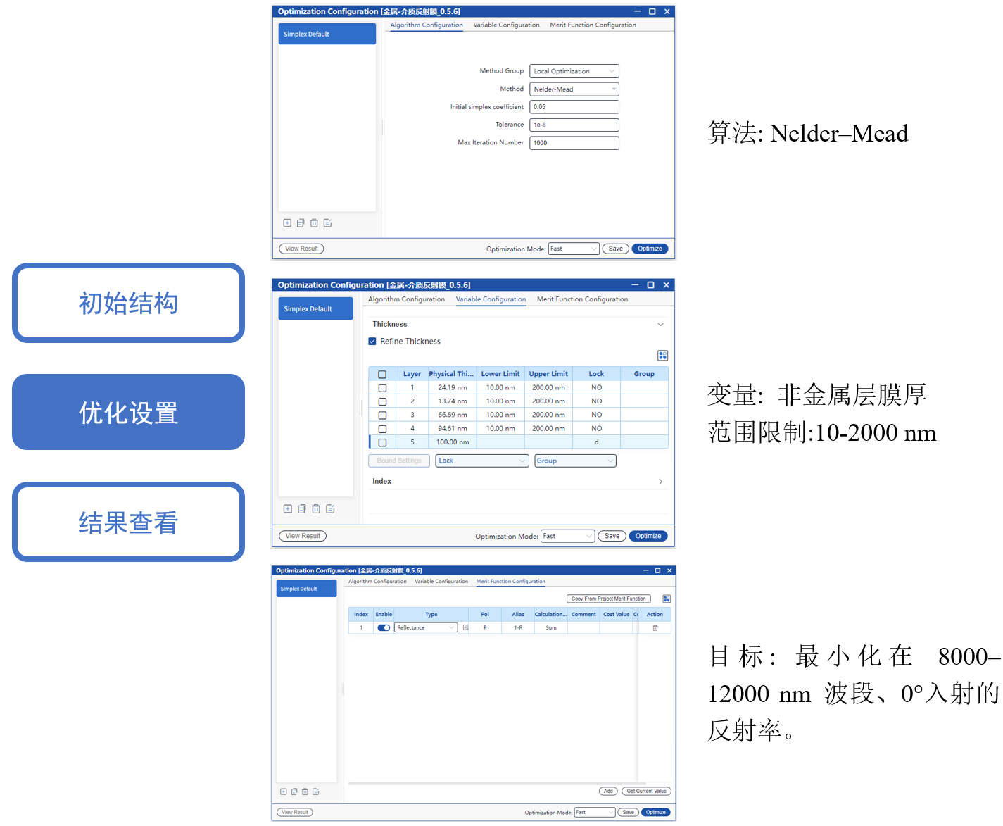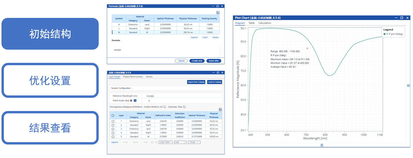 在本應(yīng)用案例中,通過合理的初始結(jié)構(gòu)設(shè)計并結(jié)合后續(xù)優(yōu)化,我們設(shè)計了一種金屬-介質(zhì)高反膜,能夠在可見光和近紅外都提高都具有良好的反射效果,滿足了天文觀測要求。