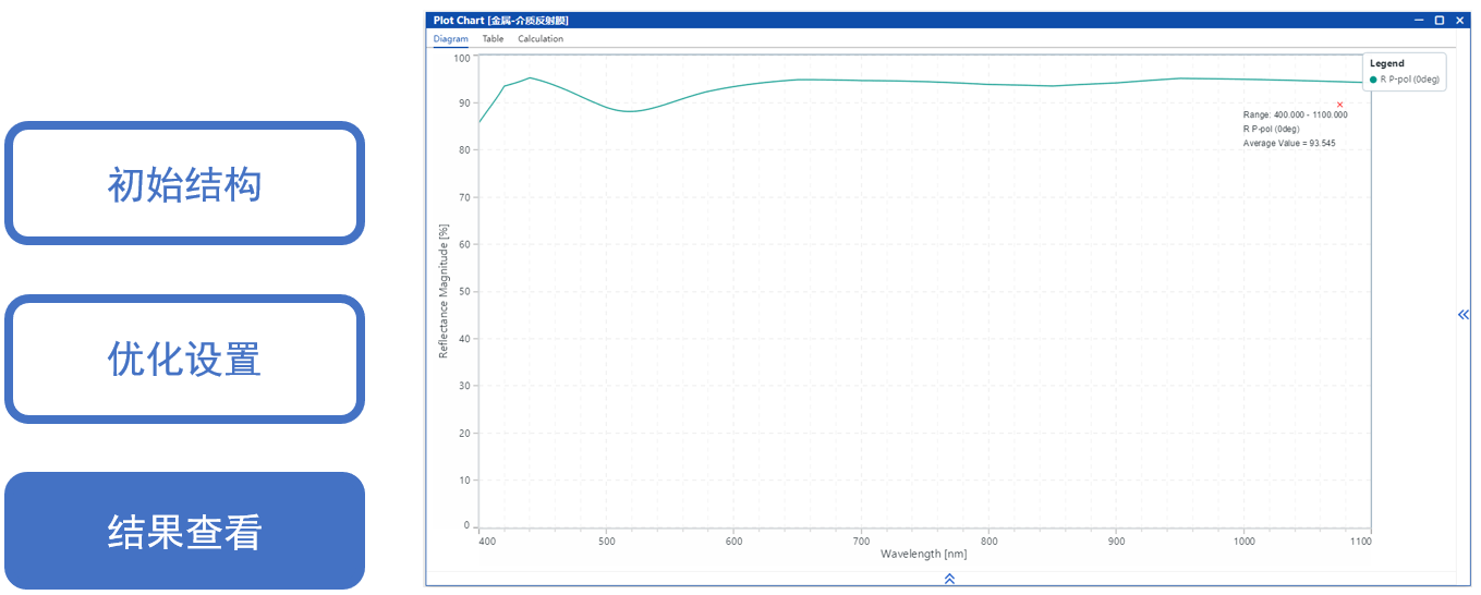 在天文觀測中,由于需要觀測早期星系和深空圖像,所以工作波段要求較寬,需要覆蓋可見光和近紅外(400~1100nm)。本案例中通過優(yōu)化初始結(jié)構(gòu)的層厚度,目標(biāo)是在工作波段平均反射率>93%。