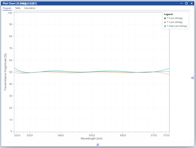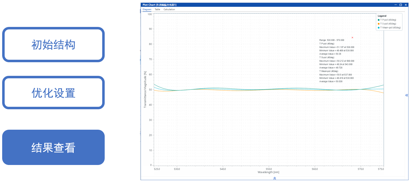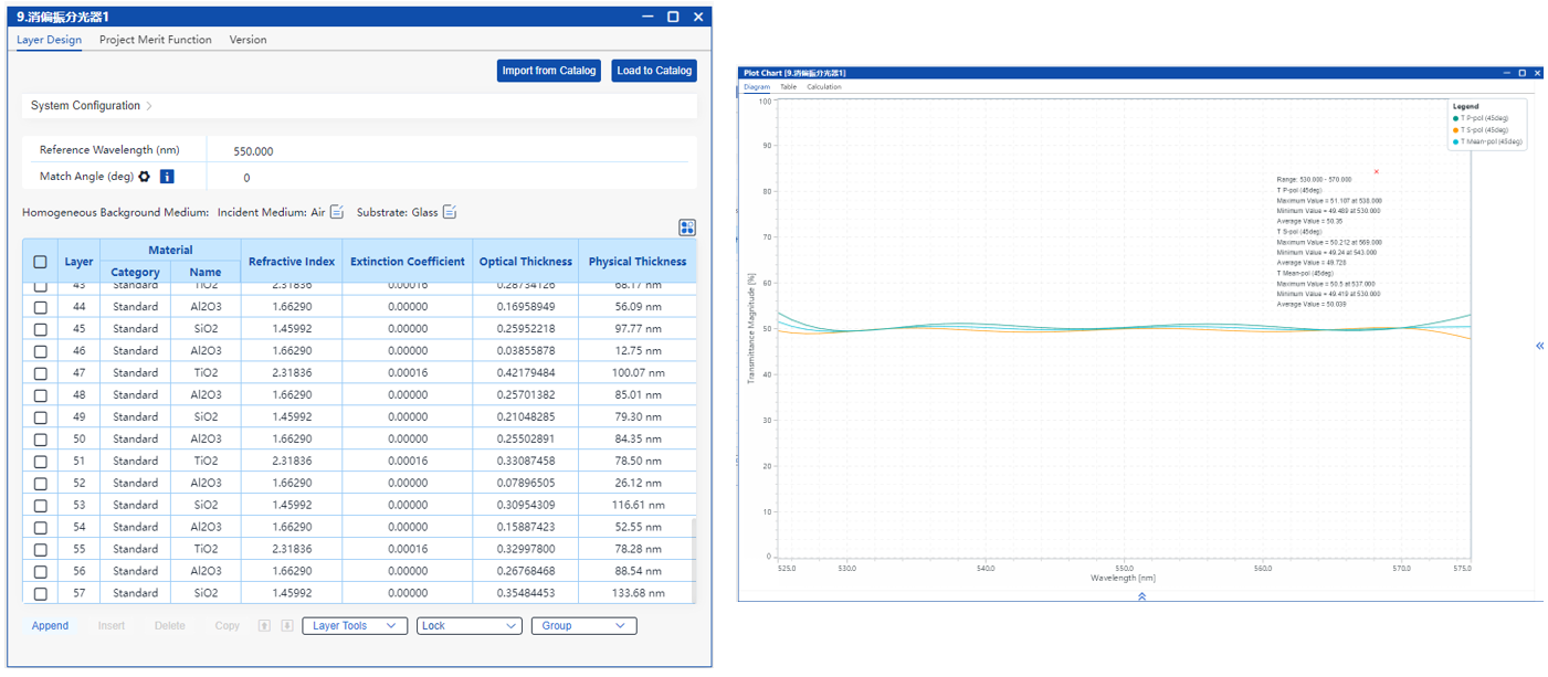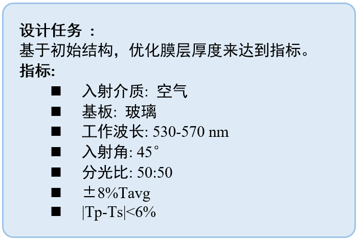設(shè)計(jì)一款消偏振分光膜,在45°入射條件下,于530–570 nm波段實(shí)現(xiàn)50:50的分光比。要求該波段內(nèi)的平均透射率偏差不超過(guò)±8%,且p光與s光的平均透射率之差的絕對(duì)值小于6%。
