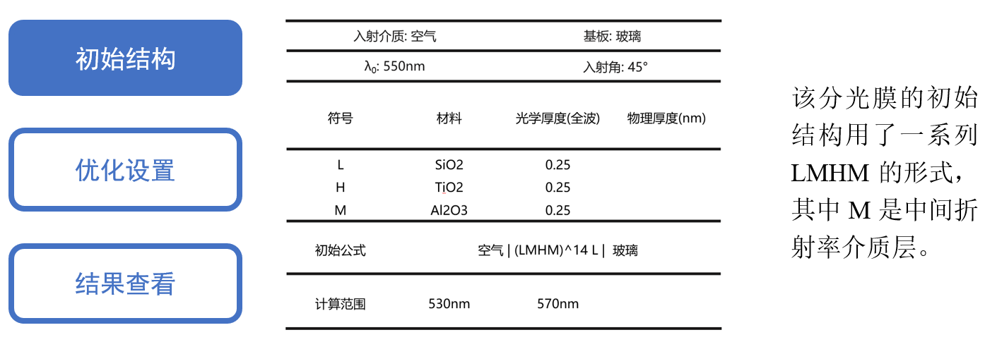該分光膜的初始結(jié)構(gòu)用了一系列LMHM的形式,其中M是中間折射率介質(zhì)層。