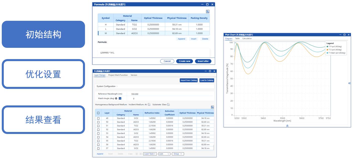 使用公式工具構(gòu)建了上述膜系作為基礎(chǔ)結(jié)構(gòu),右圖展示了其在525 nm-575 nm范圍內(nèi)45°入射時(shí)的光譜?梢钥闯龃藭r(shí)不達(dá)標(biāo)。