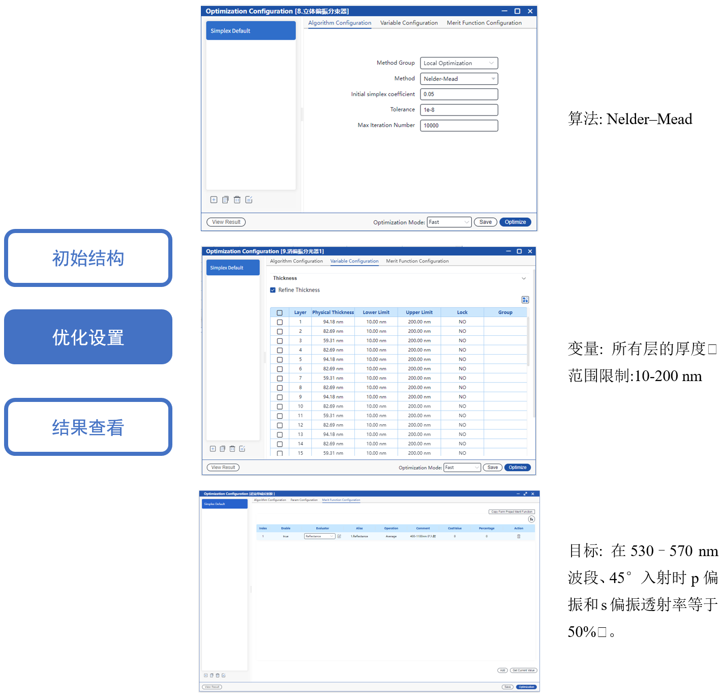 采用 Nelder-Mead 算法對(duì)各層厚度進(jìn)行優(yōu)化,目標(biāo)是在 530–570 nm 波長(zhǎng)范圍內(nèi)、45° 入射時(shí)將p光和s光的透射率等于50%。