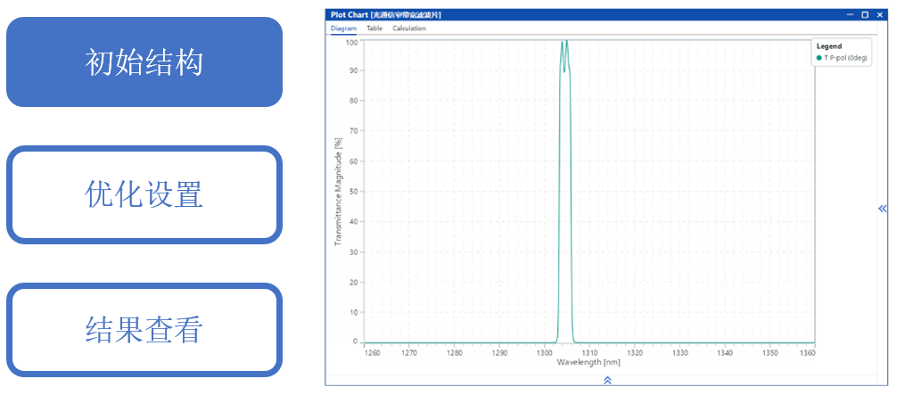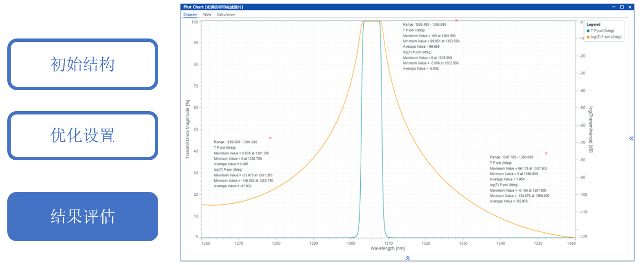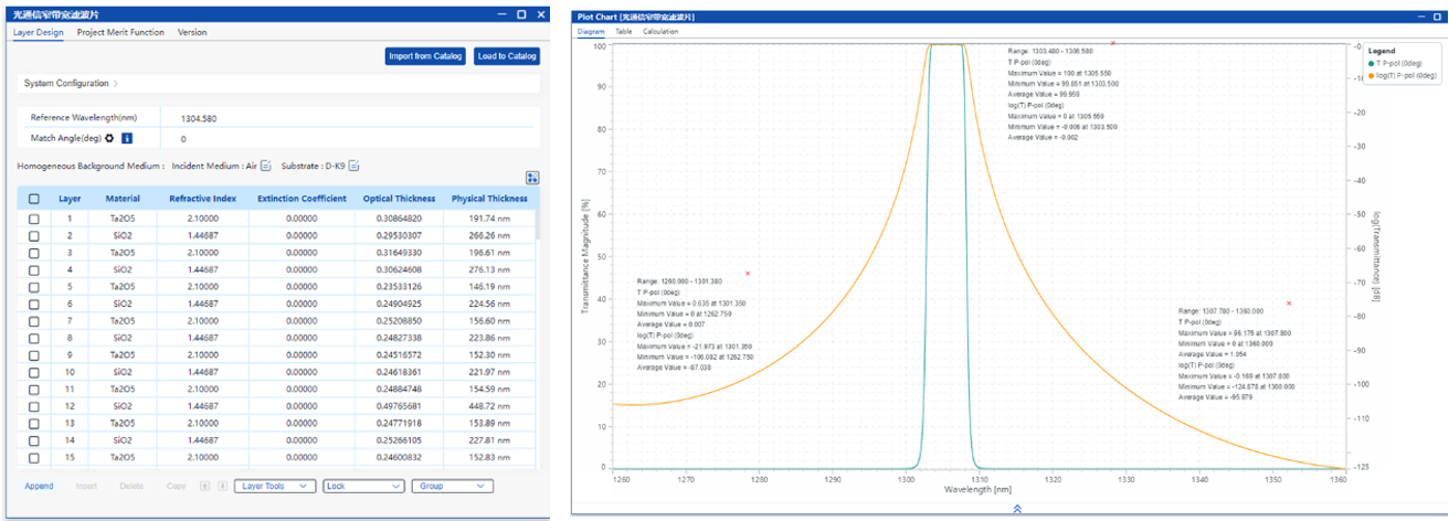 光通信窄帶濾光片需要實現(xiàn)某一特定波長的信號傳輸并且強烈抑制相鄰波長的干擾。本案例中通過合理的初始結(jié)構(gòu)生成,以及進一步優(yōu)化層厚度,目標是實現(xiàn)中心波長在1304.58nm,帶寬2.2nm,通帶最大插入損耗小于0.2dB,1260-1301.38nm以及1307.78-1360nm為反射帶,反射帶的反射隔離度大于27dB。