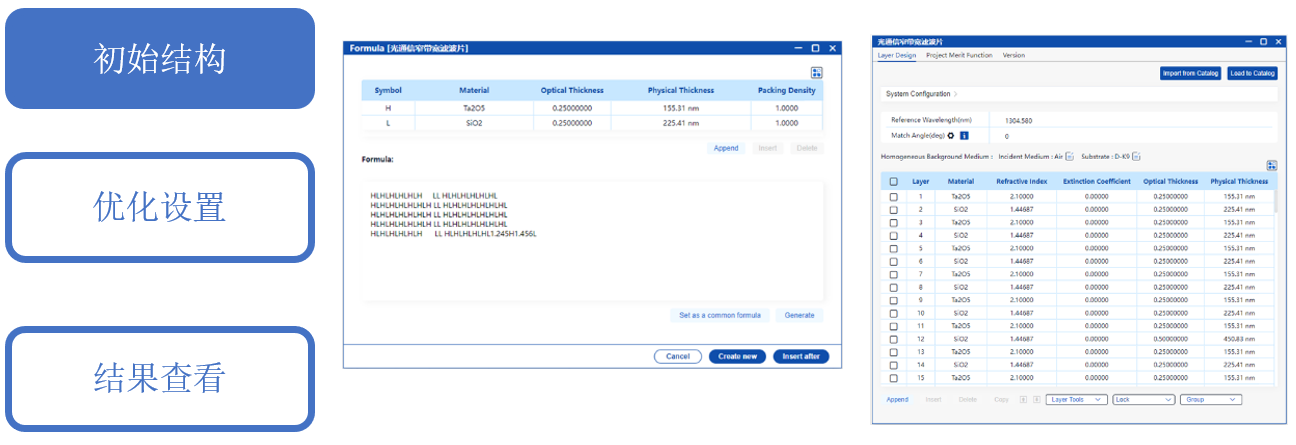從左側(cè)光譜圖可以看出,初始結(jié)構(gòu)的透射帶呈兔耳朵狀,中心出現(xiàn)了透射率下降的波紋,這是由于腔數(shù)太多造成的。接下來需要借助優(yōu)化工具進一步優(yōu)化。