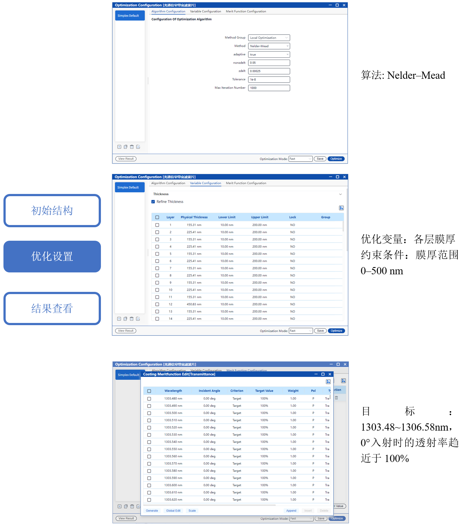采用單純形算法優(yōu)化各層膜厚,目標是在 1303.48-1306.58nm 波段、0° 入射條件下最大化透射率。關(guān)于優(yōu)化的更多信息:  Tutorial: Optimization Workflow