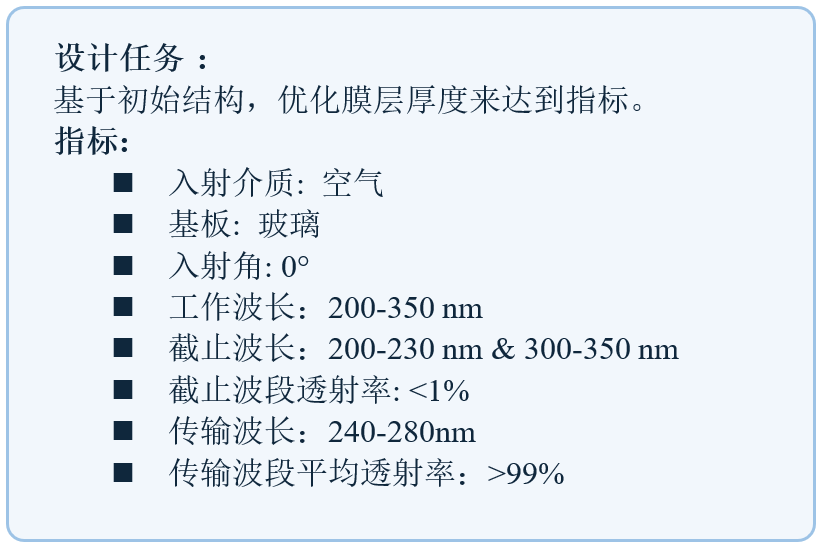通過優(yōu)化初始結(jié)構(gòu)的膜層厚度,目標是設(shè)計一款在 0° 入射條件下,240–280 nm 波段平均透射率大于 99%,并在 200–230 nm 與 300–350 nm 波段實現(xiàn)平均透射率低于 1% 的紫外帶通濾光膜。
