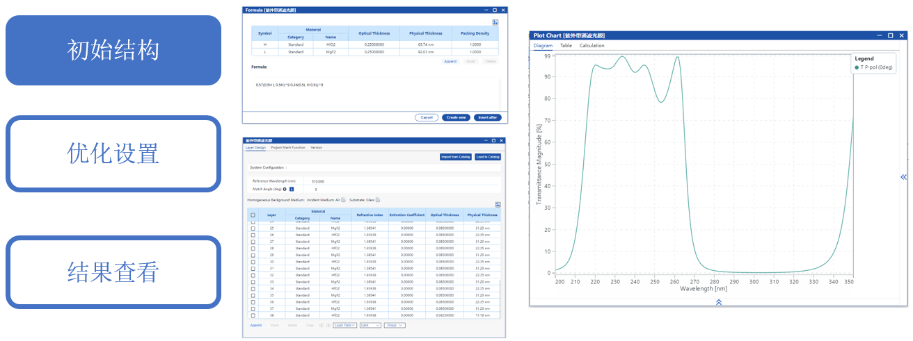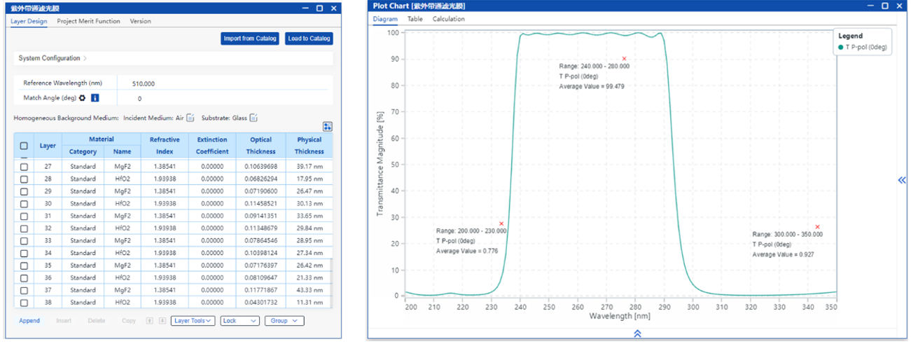 在本應(yīng)用案例中,我們設(shè)計了一種適用于日盲紫外探測器的濾光膜。以長波通與短波通濾光膜組合為初始結(jié)構(gòu),通過優(yōu)化膜層厚度,成功實現(xiàn)了在 240–280 nm 波段內(nèi)具有高透過率、兩側(cè)波段具備高截止特性的紫外帶通濾光膜。